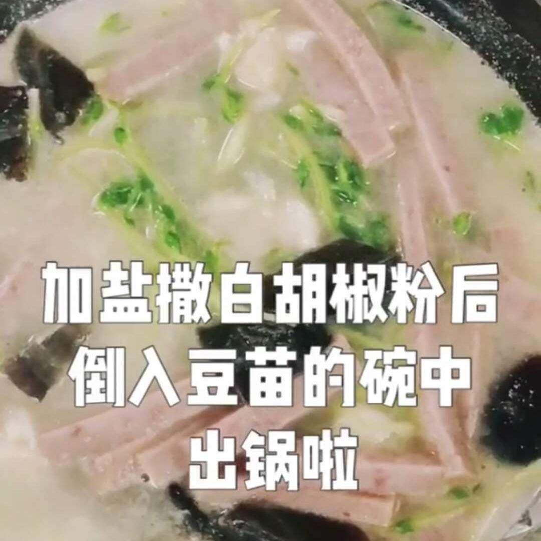 原料:豌豆苗1000克、皮蛋一个、蒜子五个、淀粉20克、火腿80克