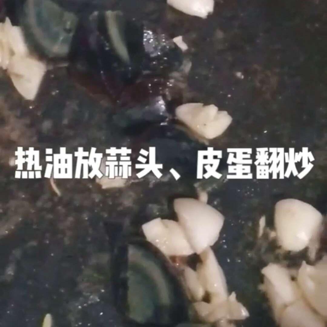 2.将皮蛋切成小丁、火腿切丁,热锅倒油放入蒜子、皮蛋、火腿丁煸香。