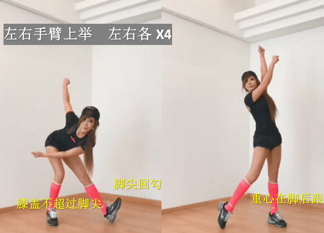 以上所有动作循环做2组即可,总共用时2分40秒左右,听着快节奏音乐一起练,还是欢快的。动作虽然简单,但是要到位,脚尖回勾时脚后跟要用力往前蹬,支撑腿将重心放在脚后跟,能够在瘦腿的同时,刺激臀肌,对臀部也有一定的燃脂果哦。