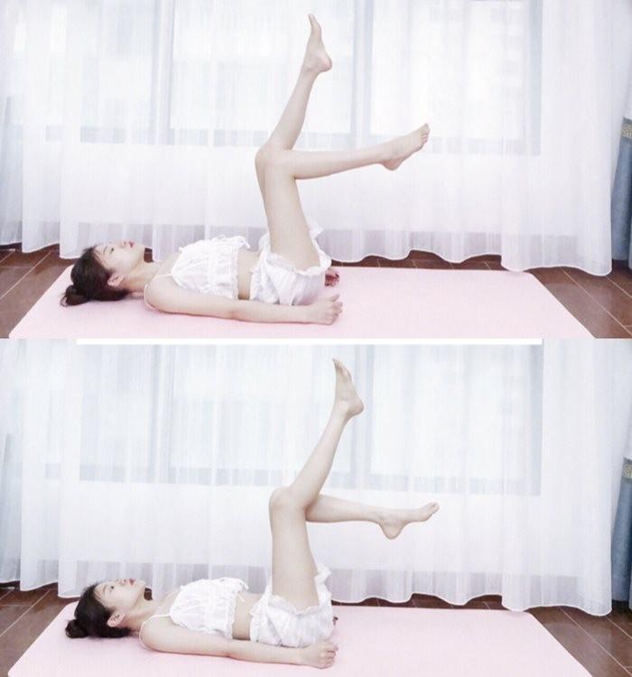 平躺在床上或者沙发上,保持后背平直,收紧腹部,将双腿合并并向天花板方向伸展,双腿与地面呈九十度直角。