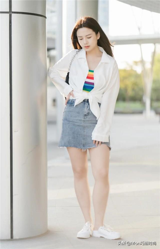 ⭐短上衣+高腰下装:聪明的女孩子可以尝试短款的上衣搭配高腰下装,借助上短下长的搭配技巧来修饰你的身材,塑造出苗条的感觉。