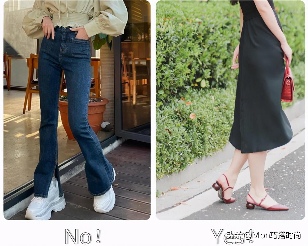 如果属于下半身比较胖的类型,好的办法是搭配一些轻盈的鞋履,避免厚底鞋或者是老爹鞋,这些鞋子都是很厚重的款式,踩在脚下只会显得累赘老气,显得腿粗还短。从下面的对比就可以看出来,左边的老爹鞋更显胖,不太适合腿粗的女孩。