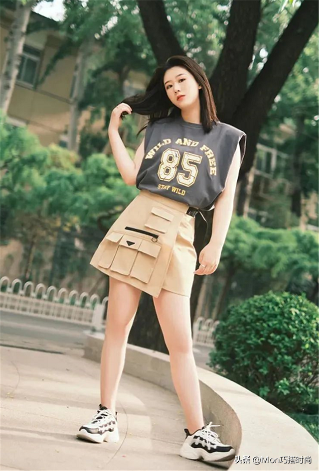 高腰裙的裙摆要尽量宽大一些,不然勒出大腿的赘肉,反倒是显胖和臃肿,这类工装半身裙就是不错的选择,搭配T恤或者衬衫都可以。