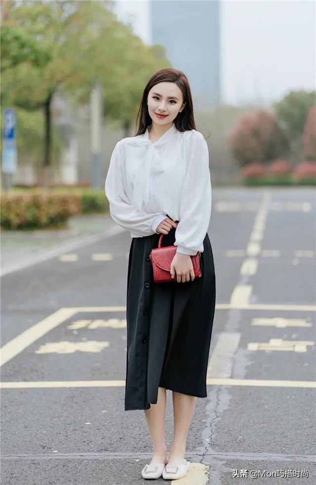 浅色的衬衫搭配黑色半身裙,层次感十足,自带亮点。深浅结合的造型也能够避免整体搭配太沉闷,可以打破单调。