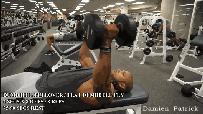胸肌动作6:仰卧曲臂上提练胸时很少有人做这个动作,但这对扩张胸腔是好的训练动作。这一个动作能够刺激你的胸肌,背肌以及前锯肌。将这个动作作为收尾的好处是能够很好地拉伸胸肌,体验感很棒。