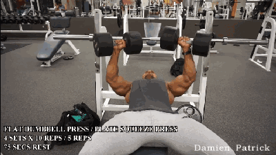胸肌动作2:平板哑铃卧推哑铃卧推要比杠铃的活动范围大所以刺激也更深,但对平衡性协调性要求也相对较高。