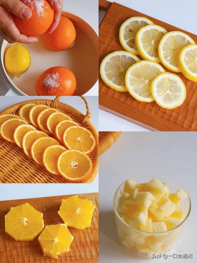 这几种水果都是热量低的水果,含有丰富的维他命C,可以美白减脂,味道酸酸甜甜的很解腻。所需材料包括苹果1个、橙子3个、柠檬1个、适量老冰糖以及茉莉绿茶1包。