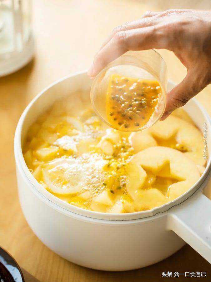 接下来要推荐的是低卡好喝的百香果苹果茶,百香果被称为“果汁”,它具有排毒养颜、抵抗衰老、化痰止咳、帮助消化等功。所需材料包括苹果2个、柠檬5片、百香果2个、热水1升、蜂蜜少许以及红茶包(可依据个人喜好添加)。
