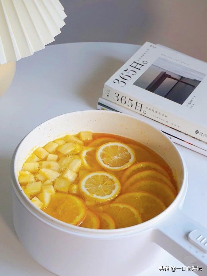 6. 煮开后先挤柠檬汁,然后逐一把柠檬片、橙、苹果和茉莉绿茶放进锅里煮几分钟就可以喝了。
