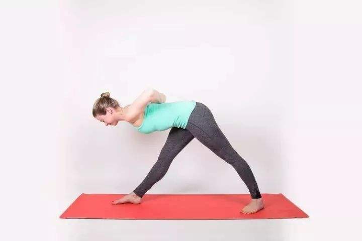 体式详解山式开始,手放在臀部。右脚向后退一步。后脚外转45到60度。骨盆与前方平行对齐。吸气,拉长侧腹和躯干的整个前部。双手放在背后,呈祈祷式,呼气,拉长脊椎向前腿。闭上眼睛,在前弯中保持8到10次呼吸。然后松开手,放在臀部。吸气抬起身体回到山式,换边练习