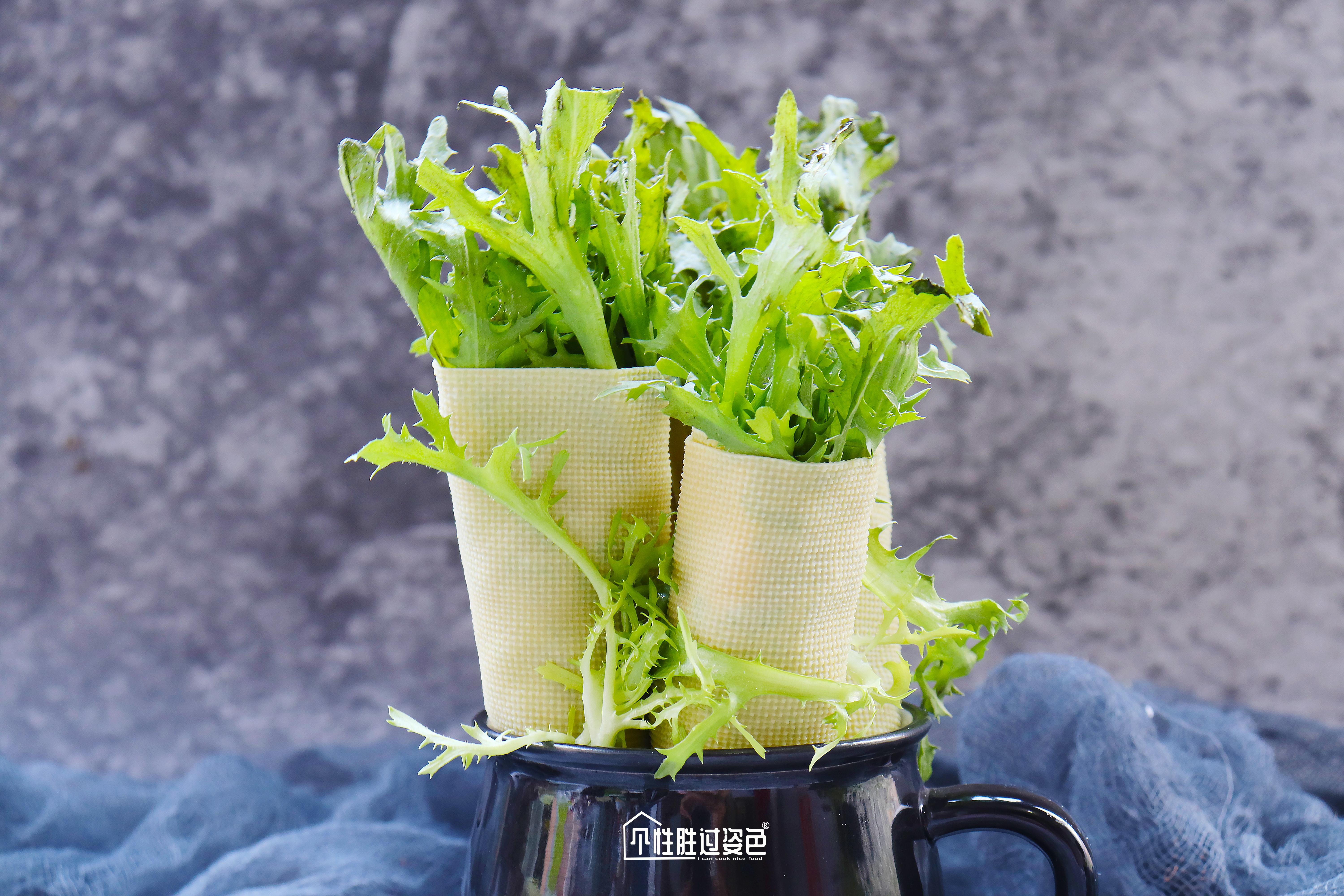 4.将豆皮卷好,用一根苦菊系上固定即可开吃