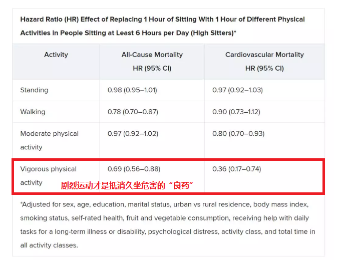 澳大利亚JACC对年龄45岁以上,样本量达26万人的研究发现,能有弥补久坐损伤的,恐怕只有高强度的锻炼——