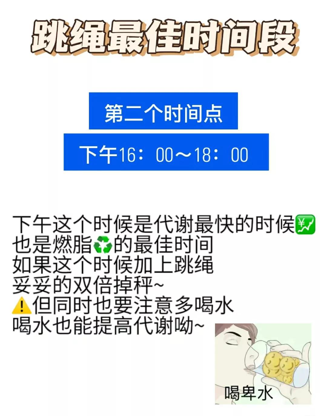 下午这个时候是代谢快的时候,也是燃脂的佳时间,如果这个时候加上跳绳,妥妥的双倍掉秤~但同时也要注意,要多喝水喝水也能提高代谢呦。