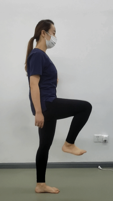 站姿屈髋:站立位扶一面墙保持身体稳定,做单侧屈髋到大腿平行地面后缓慢落下(离心控制)