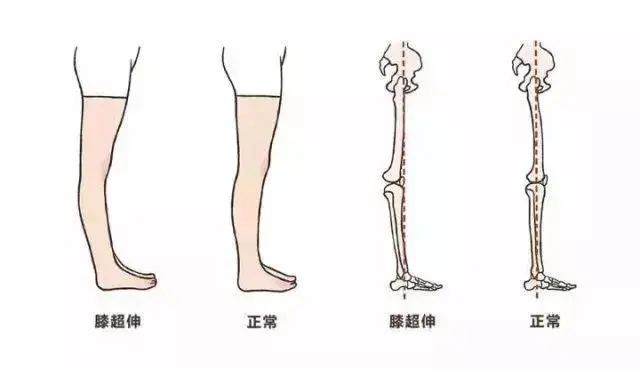 评估:站姿状态下,大转子和脚踝外侧的骨头形成一条直线,而膝关节应该正好在这条直线上,膝超伸则是指在站姿侧面观的情况下,膝盖向后,不在这条直线上,从侧面看,腿型像是一个C型。