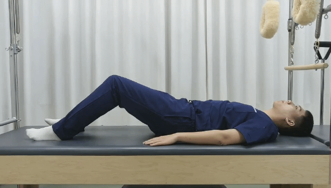 训练——臀桥:仰卧位,屈髋45度屈膝90度,双脚与髋同宽,双手放于身体两侧,腰部贴近地面,吸起准备,吐气核心收紧,臀肌发力将骨盆向上抬。抬至肩髋膝成一条直线,吸气缓慢控制下落。