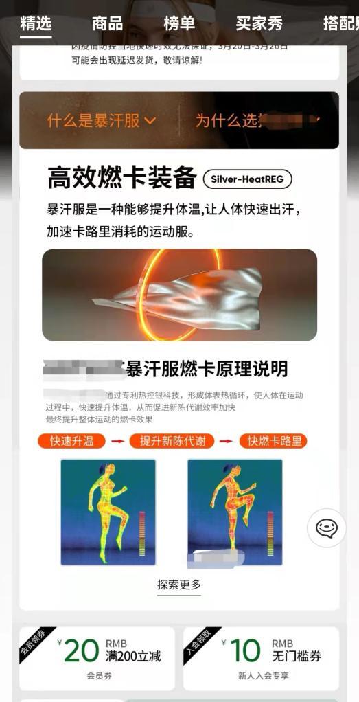 记者向一家热门单品月销超过6000件的某暴汗服网店咨询该产品,商家解释称,“暴汗服采用热控银科技面料,可以在体表形成热循环与热反射,热反射可多倍消耗热量提升身体代谢果,热循环有将身体毛孔打开激活汗腺,达到暴汗燃脂现象”,至于减肥果,“客户反馈一般月瘦2-20斤左右”。一位销售主播还宣称,“只要是易胖体质,没时间运动的,都可以穿暴汗服,提高运动率和果”。