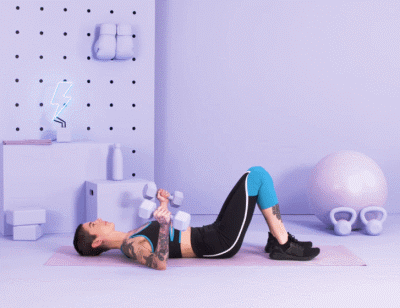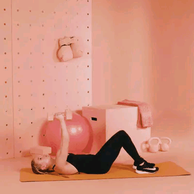 瑜伽垫子上仰卧,上身贴纸,两腿微微张开,双膝跪地,双脚蹬着,双臂弯曲,张开到身体两侧,双手抓住哑铃,抬起胸来。稳定身体,胸部用力向上推胳膊,伸直胳膊,注意胳膊肘不要稍微弯曲,不要让两个哑铃相撞。动作顶点略微停止,感受胸部肌肉收缩,调整速度,慢慢弯曲手肘,落到哑铃上。