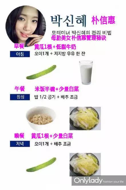 她有一个独特的饮食减肥法,就是吃白菜和黄瓜,6点过后不吃任何蛋白质或碳水化合物。为了补充营养,偶尔会喝一些营养较为丰富的水——南瓜水和红豆水。坚持了一个月左右,成功瘦下了10kg。