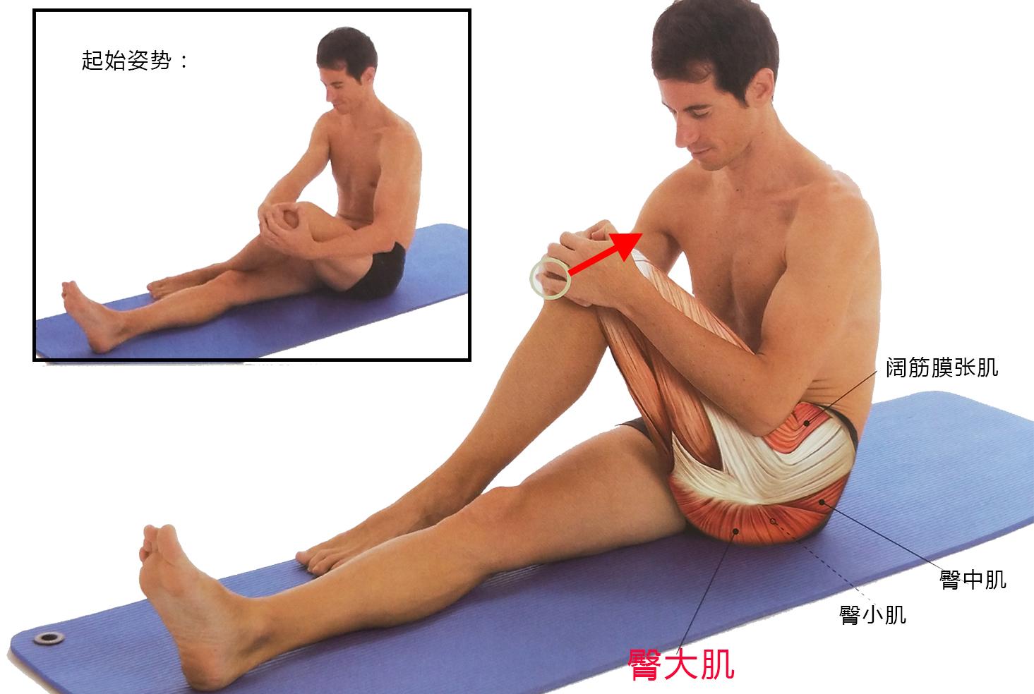 动作过程:双手轻微地把右腿膝盖朝左胸部拉伸。直到感觉右边的臀大肌有绷紧的感觉时,坚持30秒。然后换另一边以同样的方法拉伸左边的臀大肌。