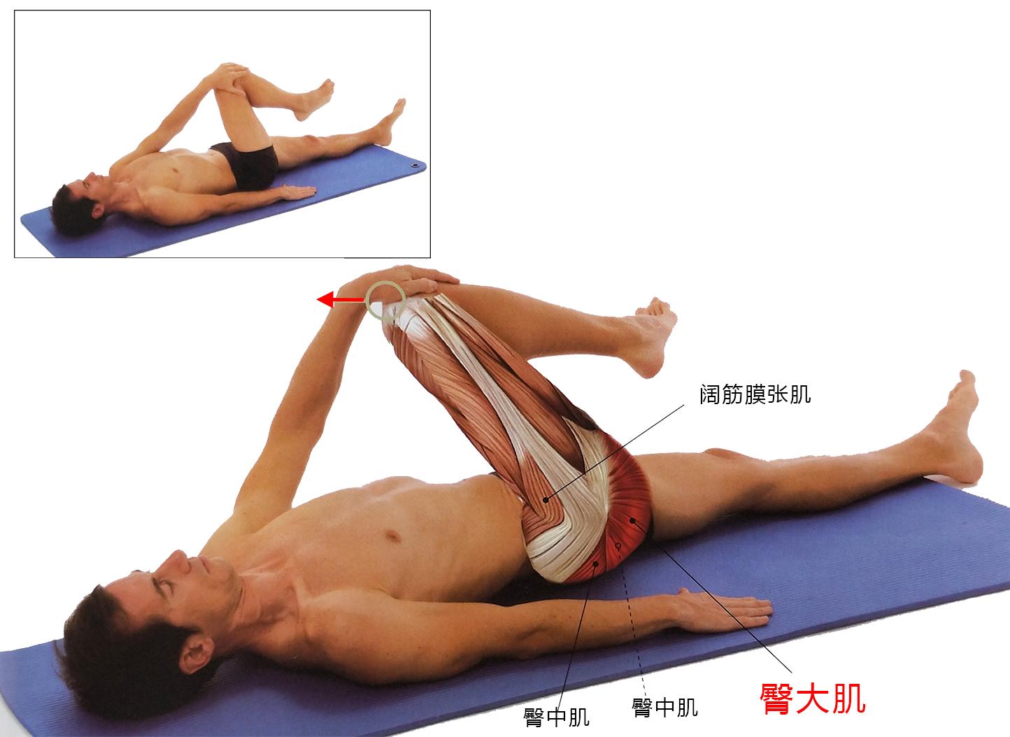 动作过程:左手轻微地把右腿膝盖朝左胸部拉伸。直到感觉右边的臀大肌有绷紧的感觉时,坚持30秒。然后换另一边以同样的方法拉伸左边的臀大肌。