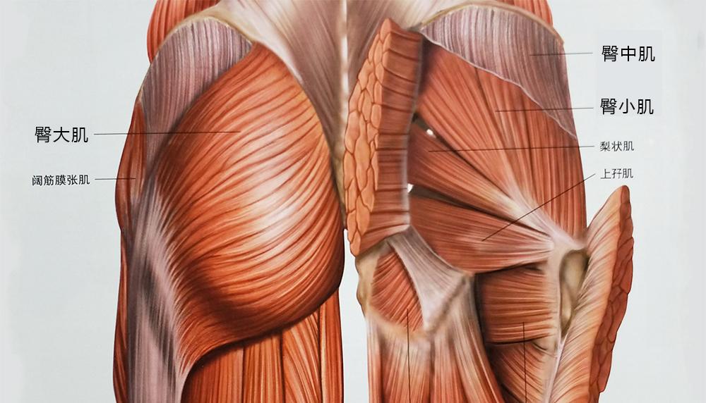认识臀部肌肉的组成。臀肌由臀大肌、臀中肌、臀小肌组成。臀大肌是臀部大的肌肉,它的作用是伸展髋关节(臀部伸展),大多数的运动项目都会使用到臀大肌,比如:短跑、跳高、跳远、网球等;臀中肌位于臀部的两侧,它的作用是外展髋关节,横向的运动都会使用到臀中肌,比如:体操、舞蹈等。臀小肌位于臀中肌深层,可以视为臀中肌的一部分,因此它的作用是与臀中肌一起使髋关节外展。