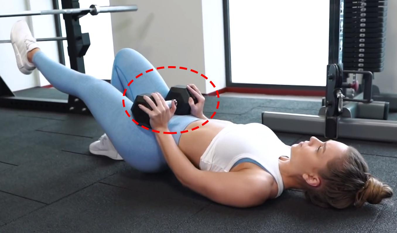 如果以上的自重臀桥的动作已标准和熟练,并且对您来说已太容易了,那么可以在髋部放上哑铃,增加阻力,让您以快的时间打造饱满紧实臀部。