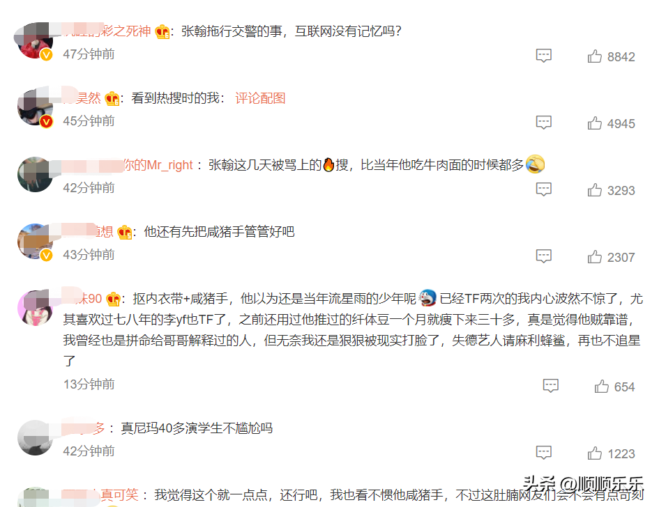 9月14日,有网友评论:一张动图直接让“张翰的手”这一词条直接登顶文娱榜热搜第一。不是自己参与影视剧的编剧写出一些油腻、不忍直视的剧情。这也不光是演员素养的问题,更是个人素质和教养的问题。既然都大肚子了,就别安排淋雨露出来的戏了呗,真的不好看。