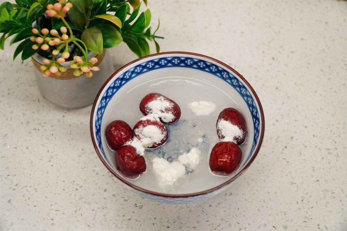 2、生姜放入碗中加清水,加一勺盐和一勺面粉浸泡10分钟后搓洗几遍用水清洗干净。取六颗红枣也同样放入另一个碗中接水,加盐和面粉清洗干净。