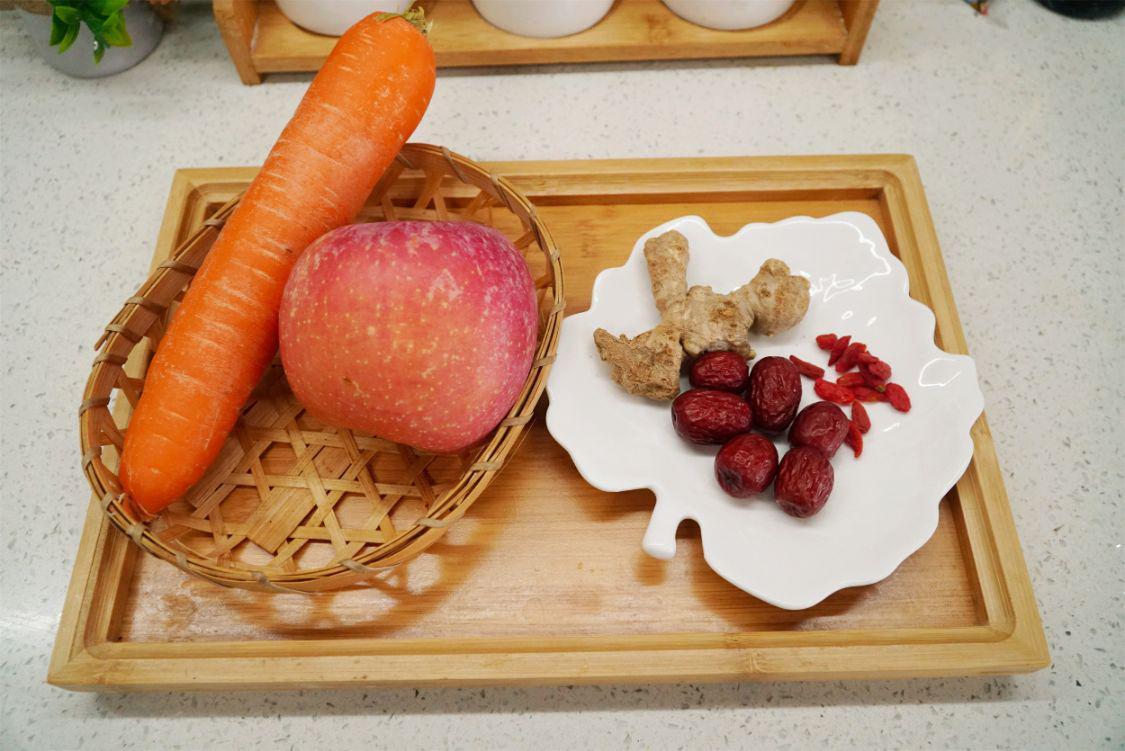 苹果胡萝卜姜汤所需食材:苹果一个、胡萝卜半根、姜、红枣、枸杞、白醋、蜂蜜。