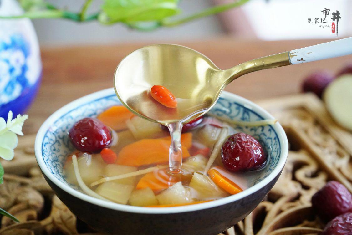 ——老井说——这道由苹果胡萝卜姜炖煮成的掉秤汤,适合早晨和晚上饮用,早晨喝可以再配上一个鸡蛋、一些青菜和适量的主食,若是晚上只需喝上一碗汤即可。加白醋是为了更好地分解身体内的脂肪与糖分,加上蜂蜜有润肠的作用,两者放入汤中,更有助于减肥。