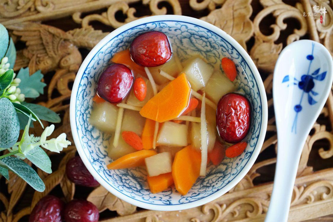 5、煮够10分钟后,把切好的胡萝卜片和红枣一同倒入锅中,继续用小火煮10分钟,然后把枸杞倒入锅中煮5分钟,煮好后即可关火,夏天饮用时可以等汤放凉后饮用,喝之前碗中加入一勺白米醋和一小勺蜂蜜,减脂润肠果更好。