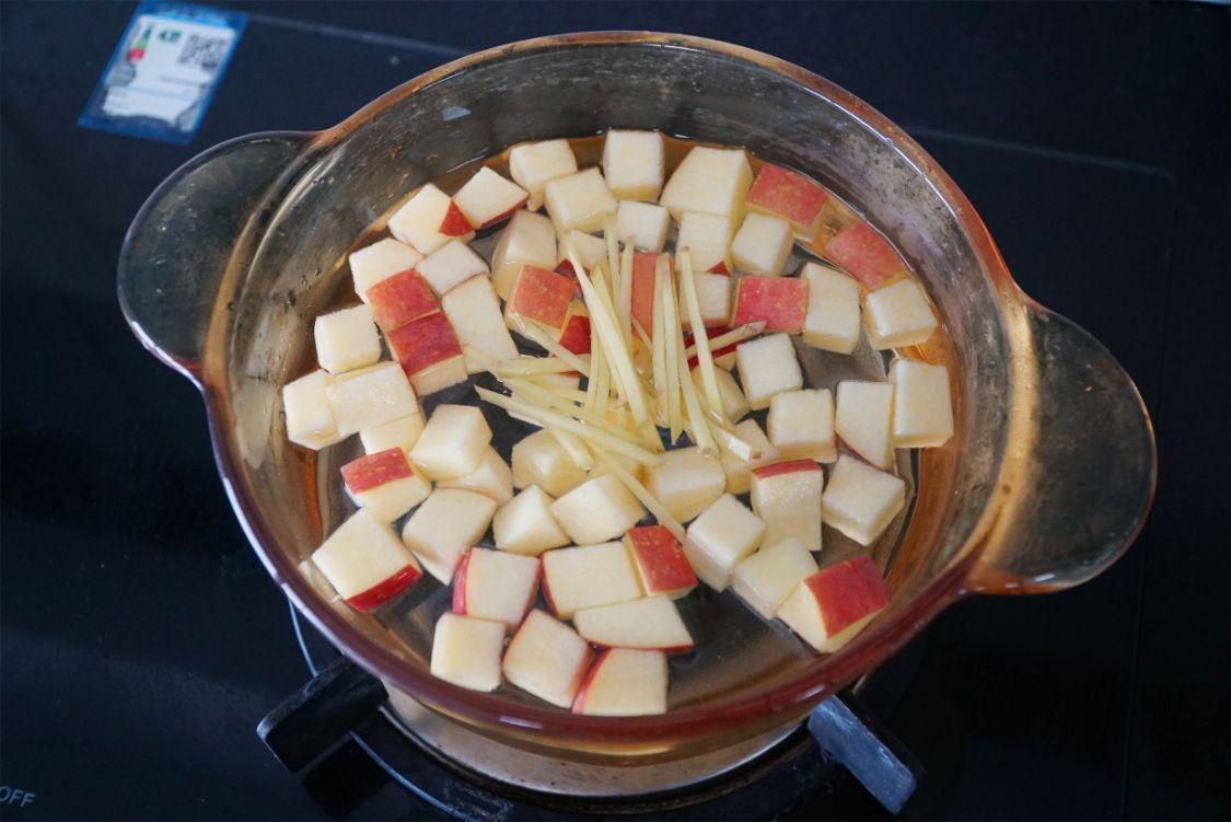 4、把洗好的苹果直接带皮切成苹果块,煮锅中接入足量的清水,将苹果块倒入锅中,加入切好的姜丝,开大火煮开后转小火煮10分钟。枸杞用清水浸泡。