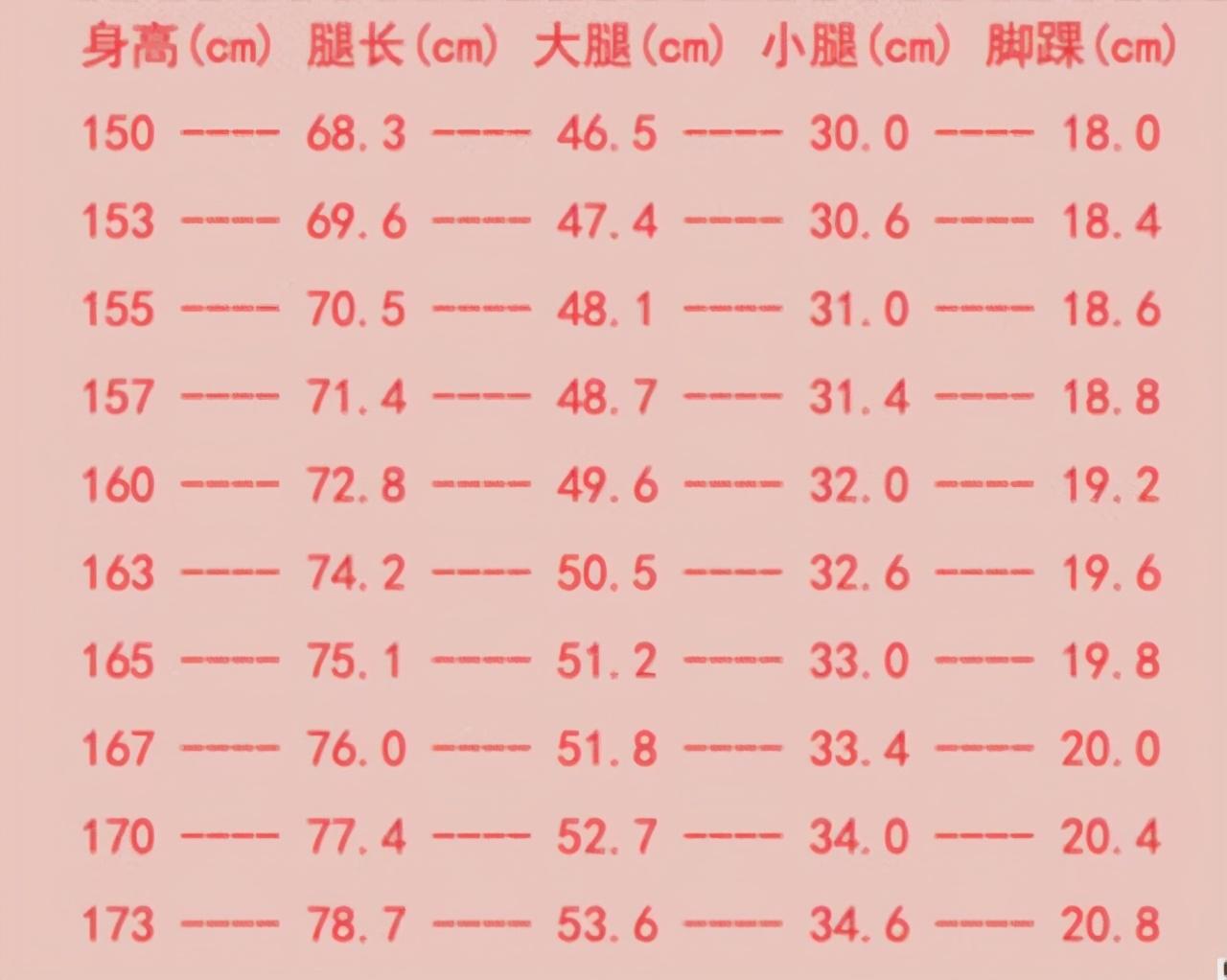 而这个围度在女生里,究竟是什么水平呢?对照下面这张女生标准腿形参考表,身高1m65的江映蓉大腿围57cm,远超标准值51.2cm!