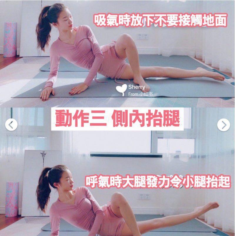 首先侧躺,身体要保持平衡。呼气的时候,一只脚弯曲屈膝;吸气时脚伸直但是不要往下落。这个动作左右两边都要做,分别做2-3分钟。