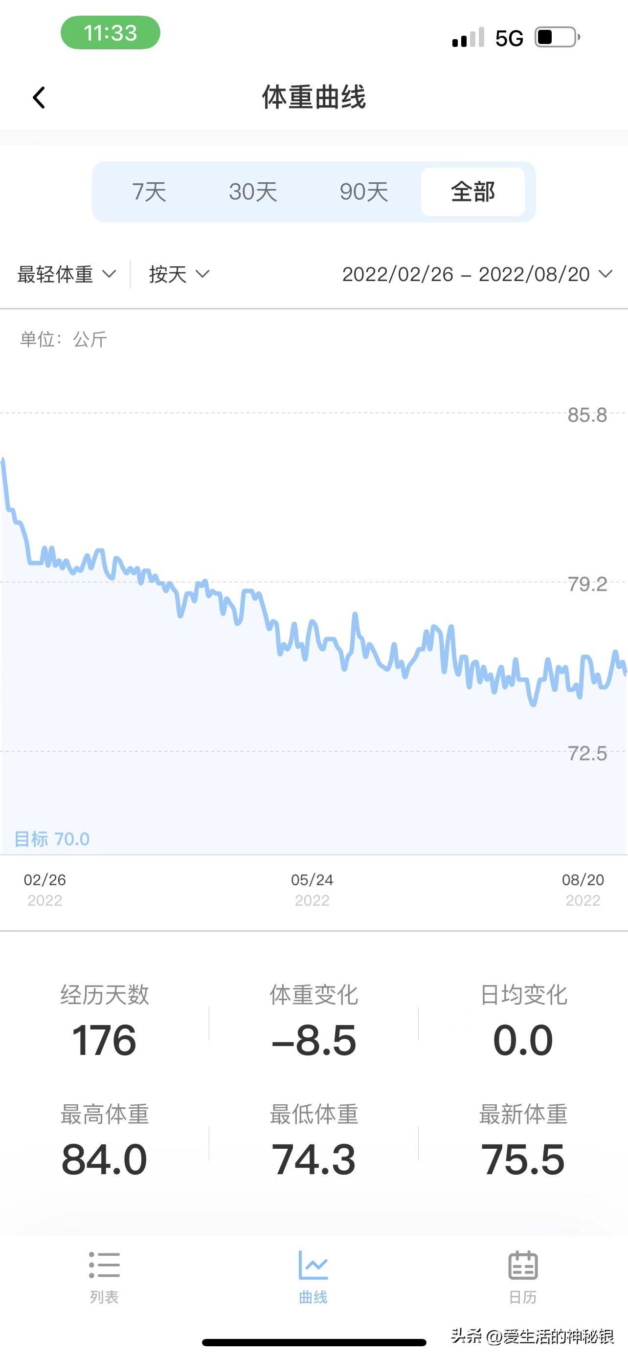 每天都会在APP上记录当天的体重,可以综合的看到变化趋势以及BMI等参数,初期掉的主要是水分比较容易,后面就经常经历各种平台期,需要熬一下才能过去,而且我也没那么自律时不时会搞点欺骗餐糊弄一下自己,所以过程是曲折的,但方向是向下的。下面具体说说身体的变化源自哪些生活的改别,属于门槛不高相对容易做到并坚持的。