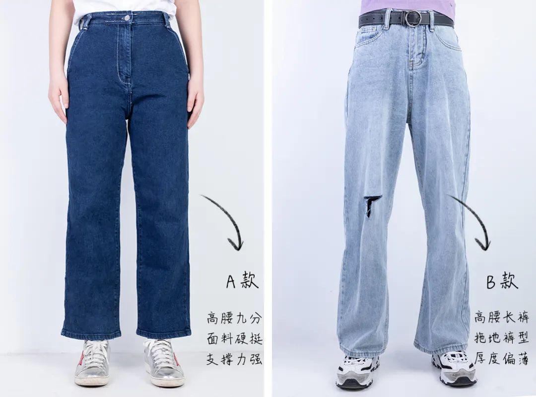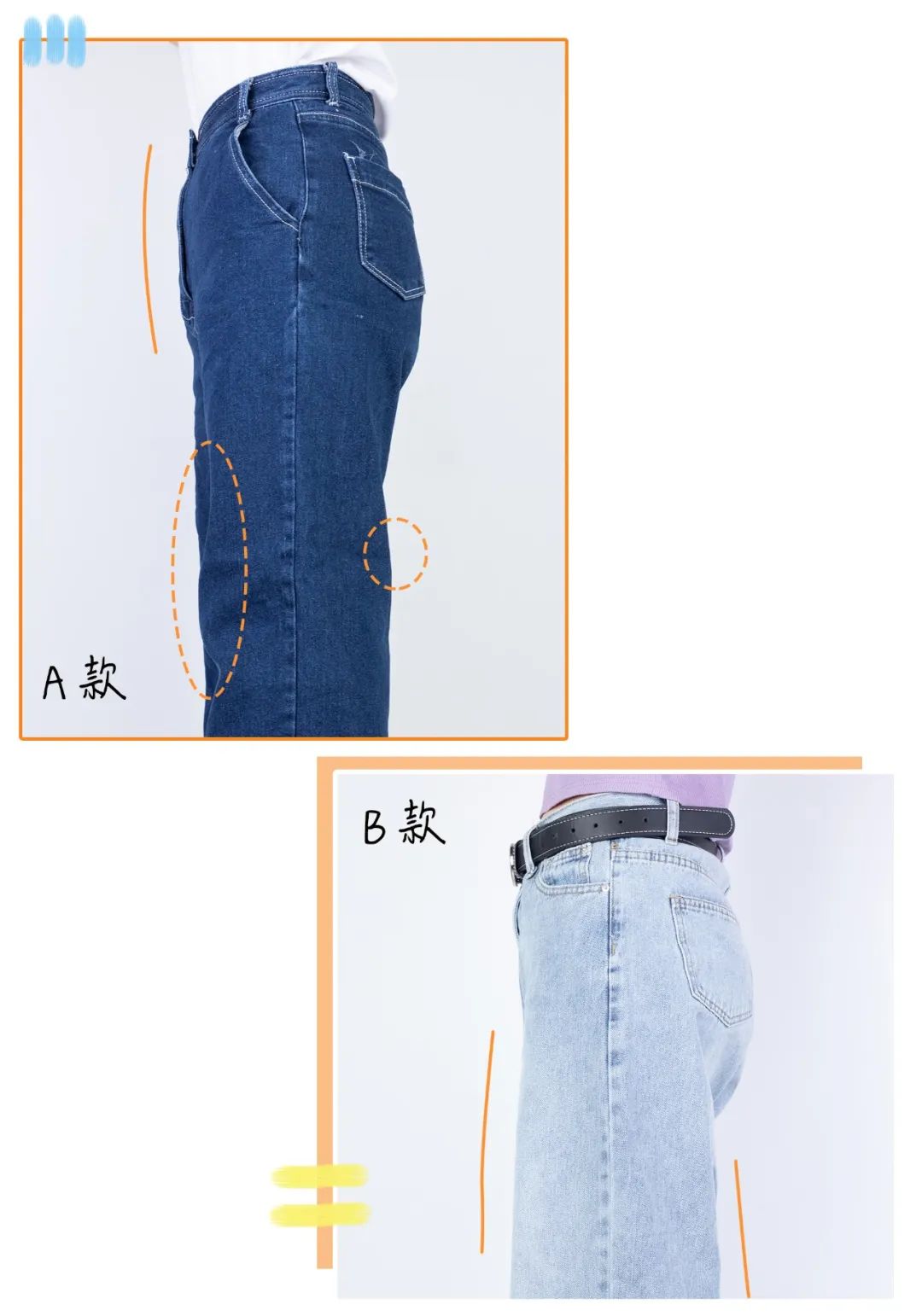 它们两款的区别就在于裤脚部分,B款在裤脚处微微收紧,但又区别于窄口裤"上宽下紧",整体还是一条直线下来的。