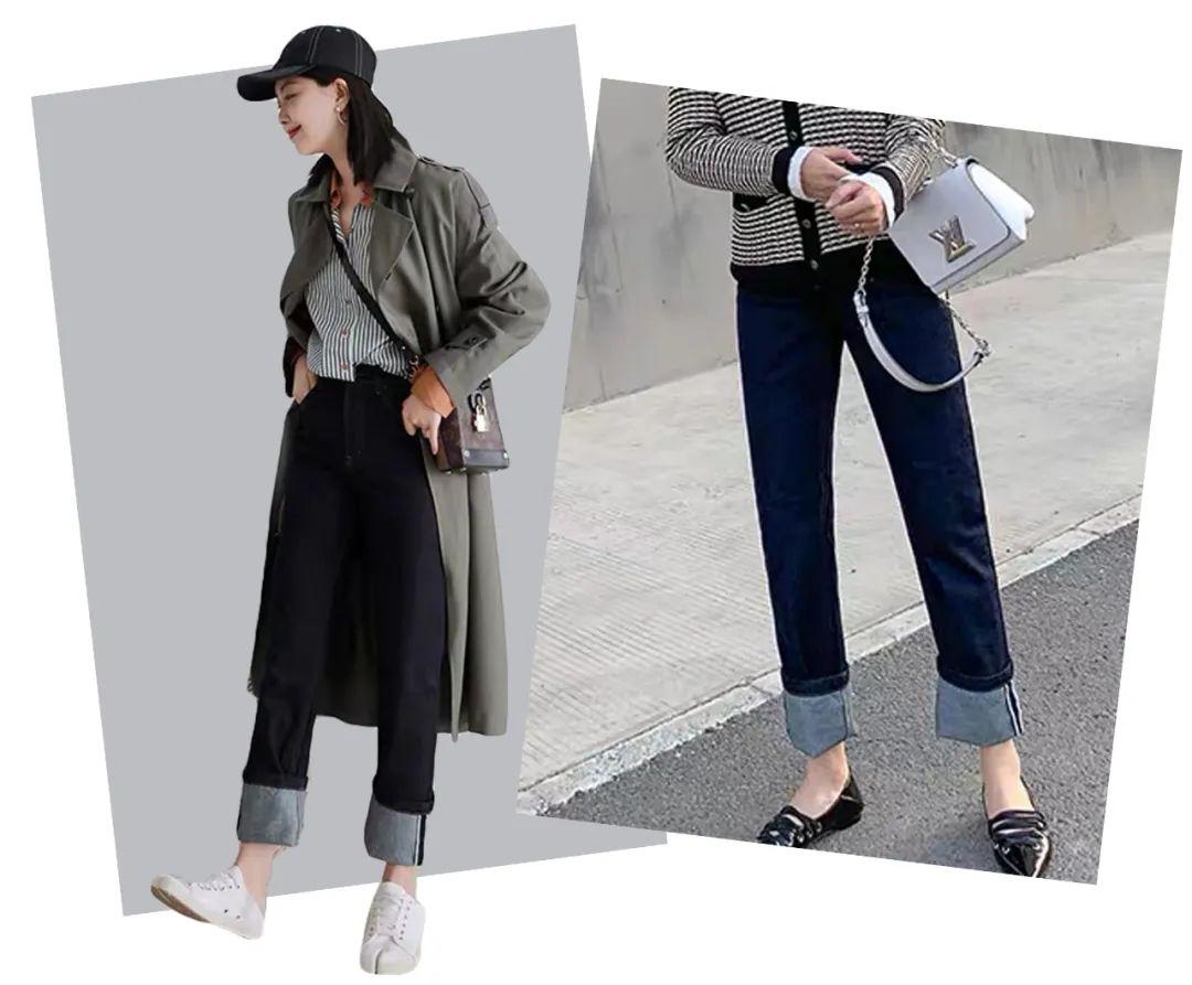 直筒裤在显腿直方面没得说,穿上这两条裤子,她的小腿完全被隐藏起来了,整体就直直的下来。