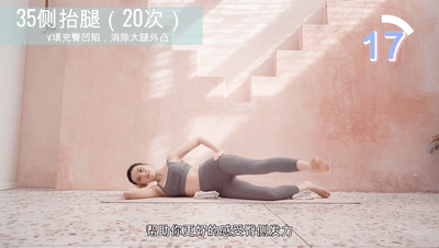 2.侧躺着,把放在上面的腿抬高至大概90°,做完20次再换另一边,再做20次。