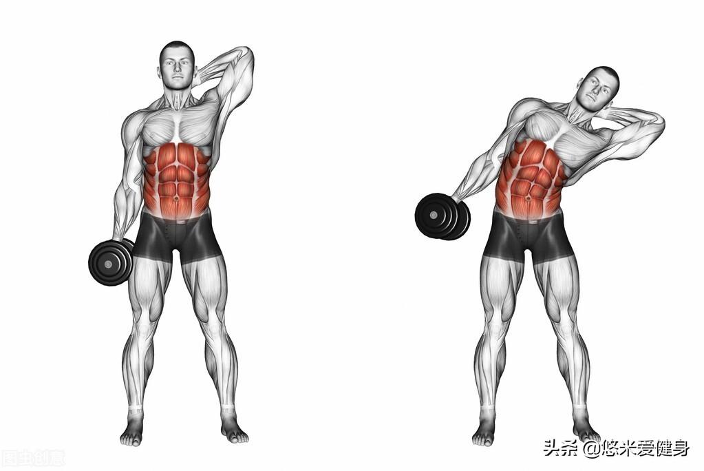 注意:右手持哑铃,向着身体左侧倾斜;左手持哑铃,向着身体右侧倾斜,负重的一侧拉伸,受力的一侧收缩,刚好相对应。