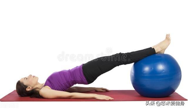 瑞士球反向支撑,它属于臀桥的顶部姿势,头部和上背部贴于垫面,双脚置于球面,两侧手臂贴于垫面维持稳定,用力向上挺髋至高位。