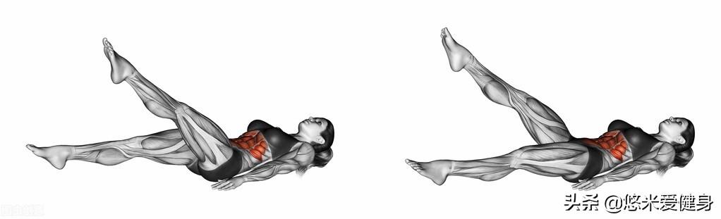 仰卧交替抬腿,它主要针对腹直肌下部,采用仰卧平躺姿势,两侧手臂和双腿伸直,先后抬起左侧和右侧腿部。