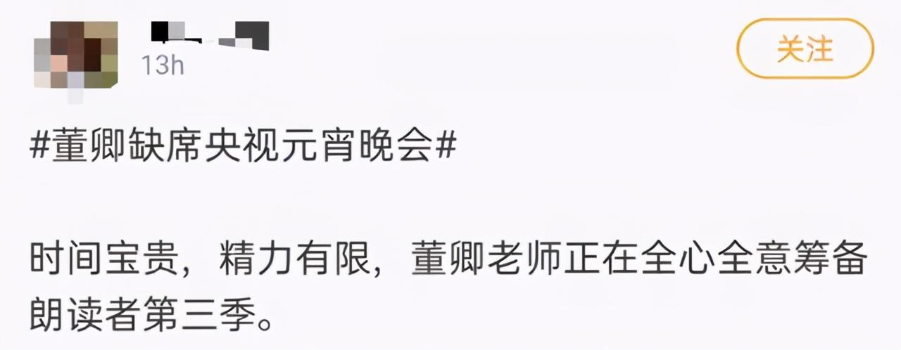 董卿进入后,先后主持了《我要上春晚》《中国诗词大会》《故事里的中国》等好节目,在舞台上端庄优雅,因此很受观众喜爱。然而近年来她却屡次缺席春晚,外界对此议论纷纷。