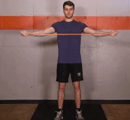 首先做“弹力带扩胸”,双手握住弹力带两端,两侧手臂向外旋转,将手臂充分向外打开,弹力带拉至大幅度即可。