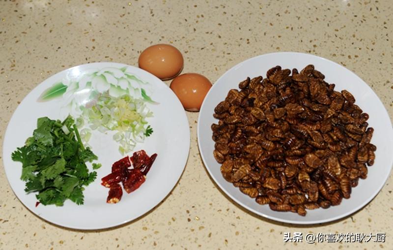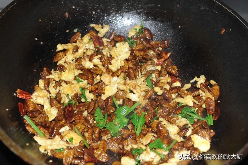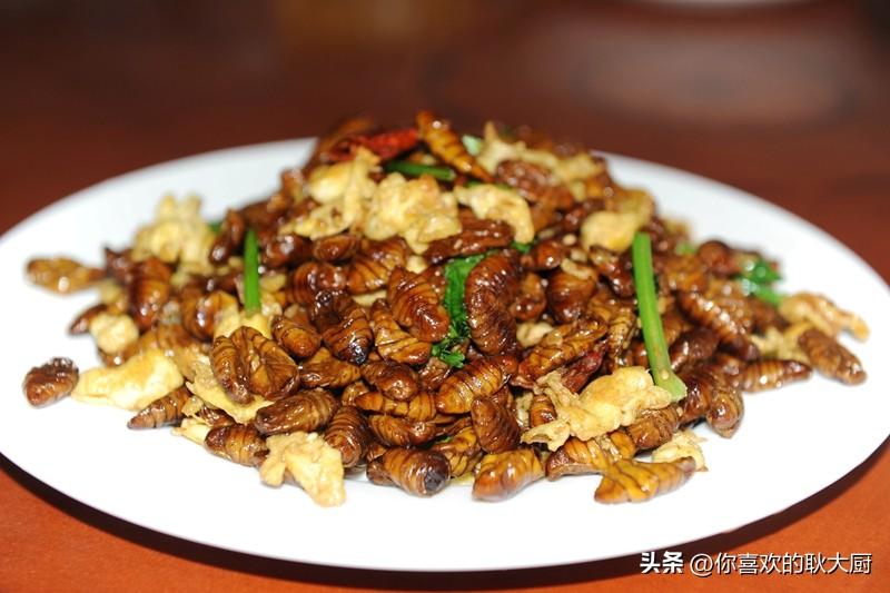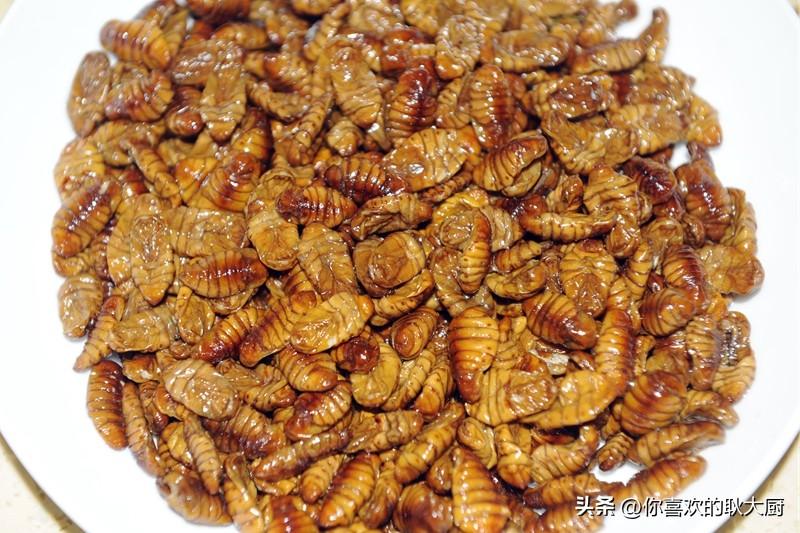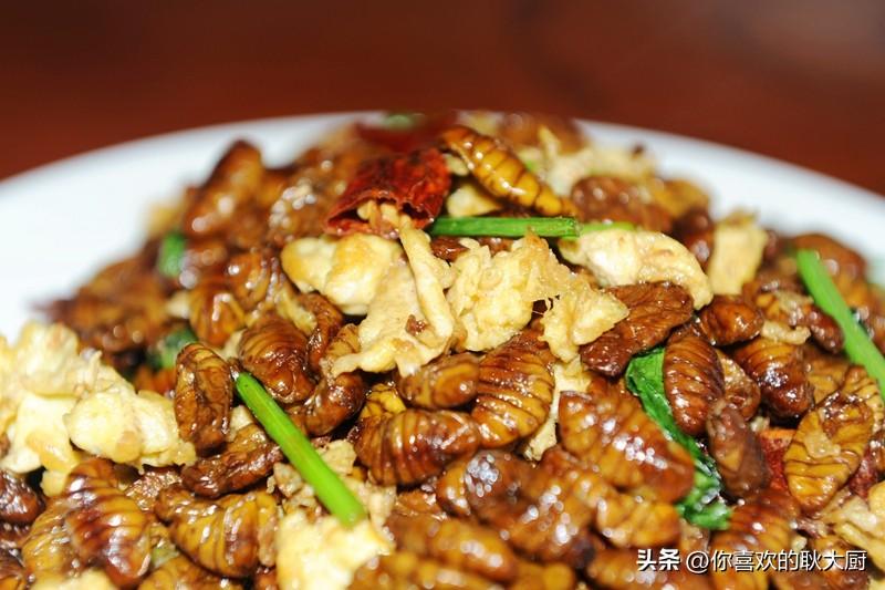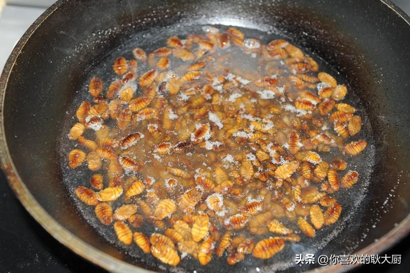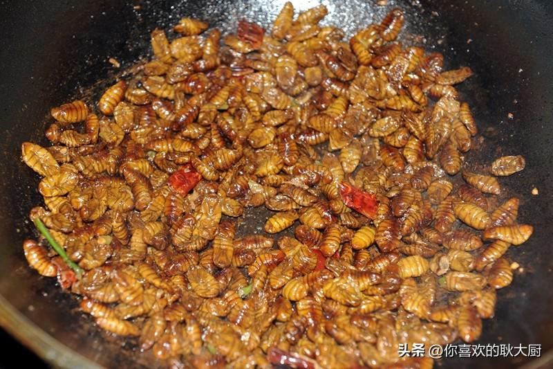 关注耿大厨,精彩美食路。蚕蛹,很多人望而生畏。其实,蚕蛹是营养价值高且食用的食材,可以说,它的营养价值和药用价值远远超出你的想象。蚕蛹含有丰富的蛋白质(粗蛋白占51%)、脂肪酸(粗脂肪占29%)、维生素素(包括维生素A、维生素B2、维生素D及麦角甾醇等)。蚕蛹的蛋白质含量在50%以上,远远高于一般食品,而且蛋白质中的必需氨基酸种类齐全且营养均匀衡、比例适当,是一种优质的昆虫蛋白质。一般人群均可食用,尤其适宜高血压、高脂血症、脂肪肝、糖尿病、肺结核、慢性胃炎患者食用;对中老年人腰膝酸软、夜尿频数、阳痿滑精者也有好的疗。那么,蚕蛹该怎么做才能大限度地保存营养且好吃呢?不推荐炸制,跟耿大厨,炒之。
