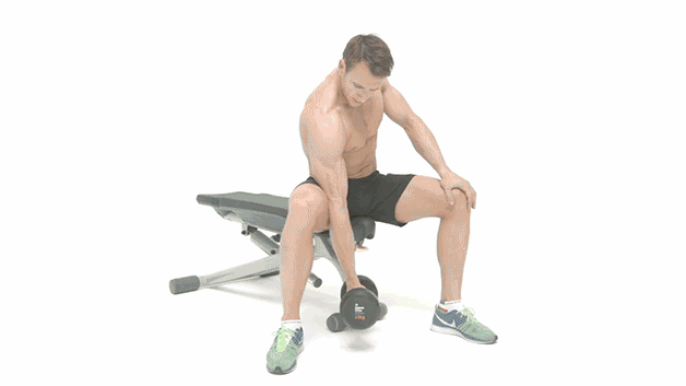 动作要领:坐在哑铃凳上,双脚打开,一只手握紧哑铃,大臂后侧贴住大腿后侧,身体倾斜,手臂发力将哑铃举起,发力呼气,还原时吸气,每组做12次,做4组。