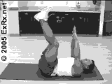 (6)触腿卷腹:俊宇常用模式,平躺垫上,大腿垂直地面、小腿平行地面(如下图,但不抱头),卷腹时手去接近小腿位置