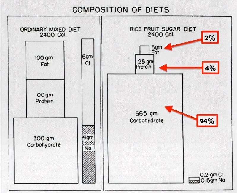 整个饮食结构中,营养素来源94%为碳水化合物,4%来源蛋白质,仅有2%来源脂肪。