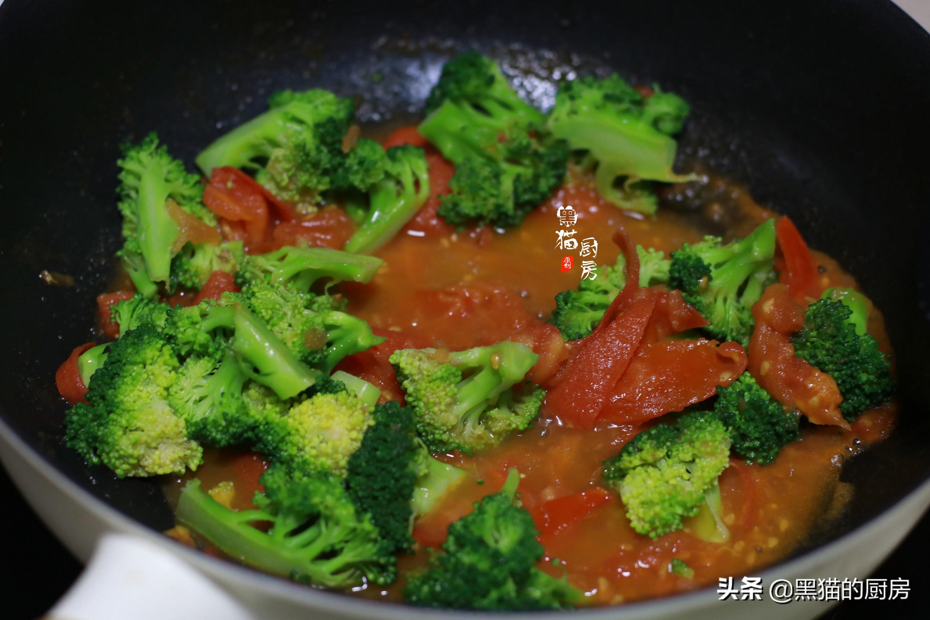 4.西兰花分成小朵后,放入热水中汆烫过再捞出,和锅里熬煮的西红柿汁儿一起翻拌均匀。