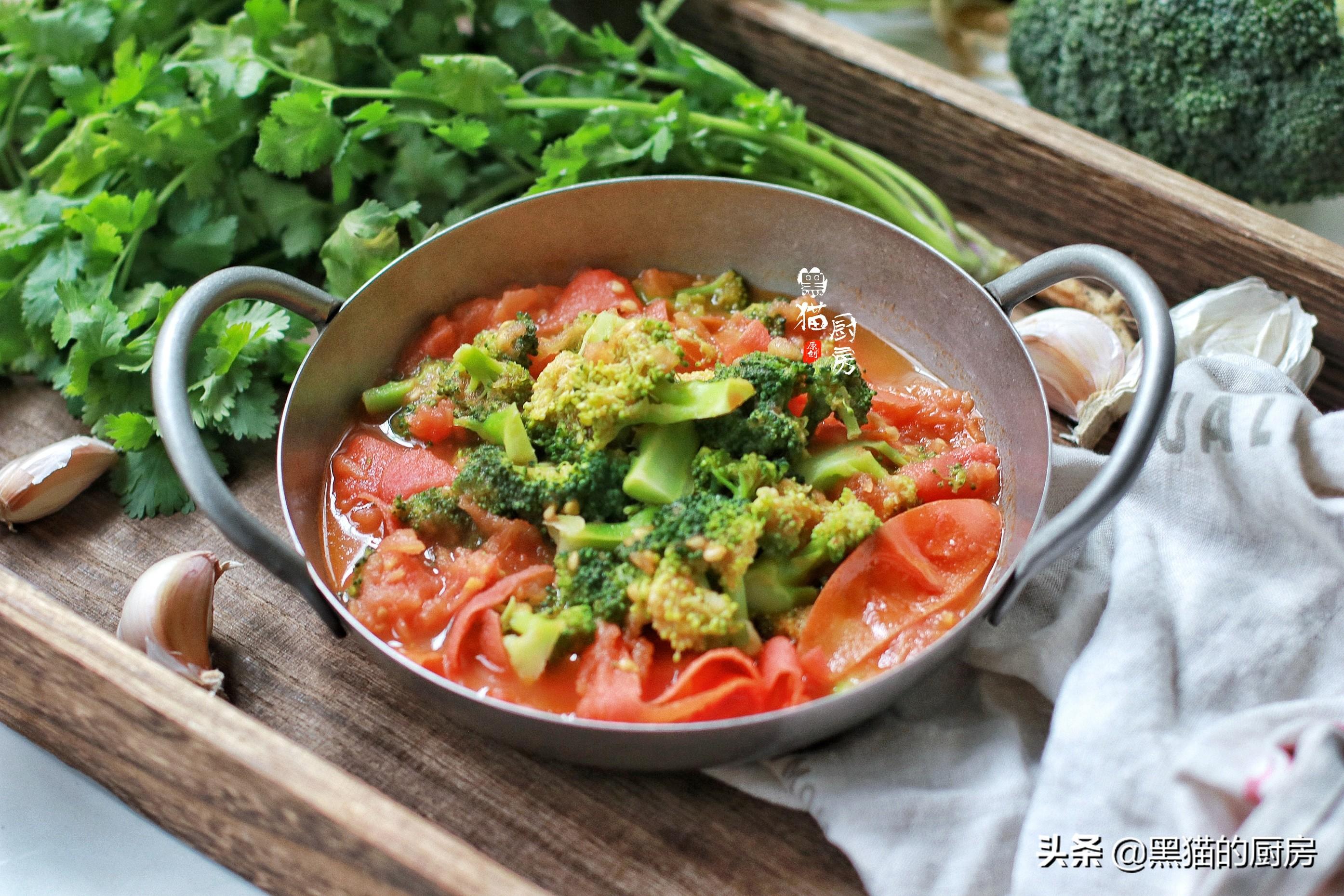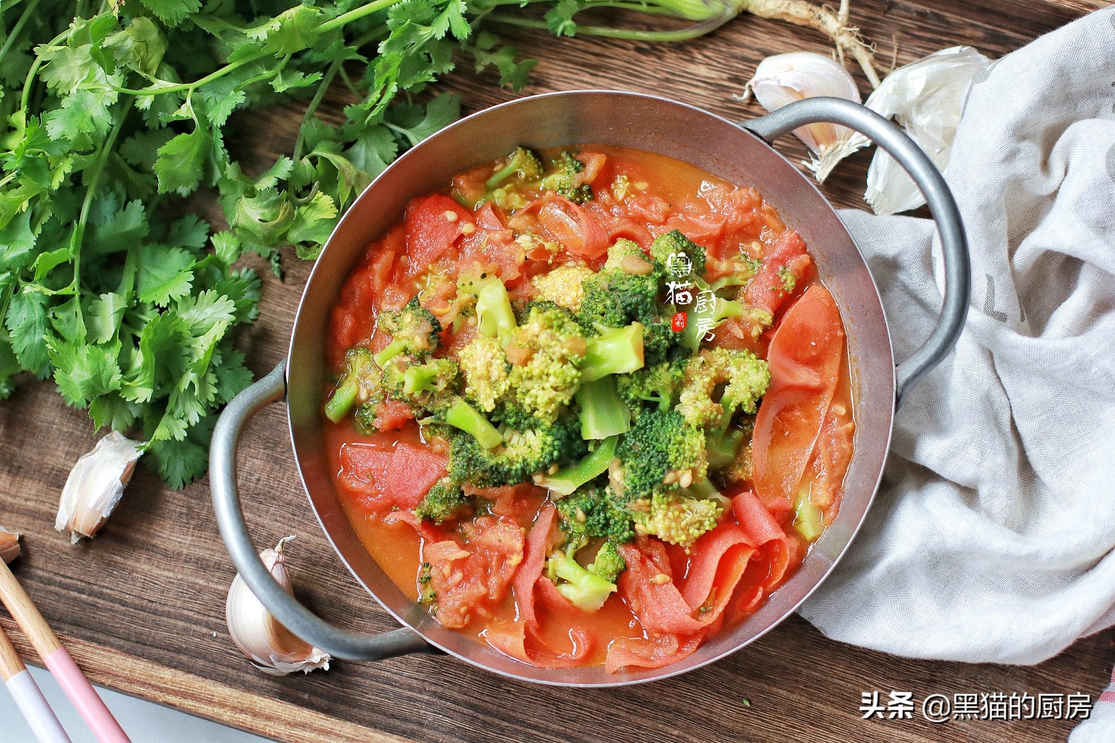 【西红柿炒西兰花】食材:西红柿2个,西兰花1个(约300克),番茄酱1勺,橄榄油1茶匙,盐少许。